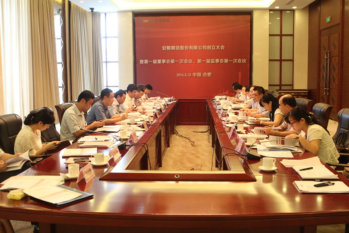 2016年8月18日,安糧期貨股份有限公司創(chuàng)立大會暨第一屆董事會第一次會議、第一屆監(jiān)事會第一次會議在稻香樓賓館徽苑巢湖廳隆重召開。公司股東單位領(lǐng)導(dǎo)及股東代表,安糧期貨經(jīng)營管理層等相關(guān)人員出席了會議。大會審議通過了《安糧期貨股份有限公司籌辦情況報告》、《安糧期貨股份有限公司章程》、《安糧期貨股份有限公司股東大會議事規(guī)則》等13個議案,審議通過了安糧期貨股份有限公司第一屆董事會、監(jiān)事會、經(jīng)營管理層人選。