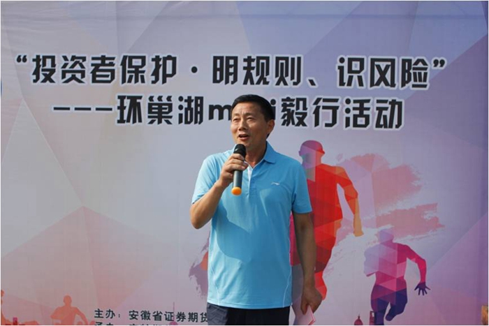 上午八點(diǎn)二十,濱湖新天地廣場(chǎng)上人頭攢動(dòng)、旌旗招展,參加此次活動(dòng)的全體員工在這里集合完畢?;顒?dòng)開(kāi)始前,安徽省證券期貨業(yè)協(xié)會(huì)副會(huì)長(zhǎng)、秘書(shū)長(zhǎng)鐘自木代表協(xié)會(huì)致辭。