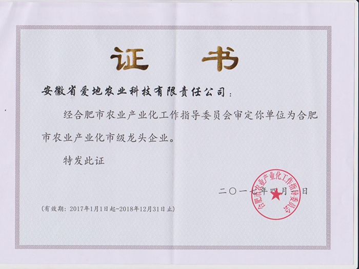 近日,愛地農(nóng)業(yè)被合肥市農(nóng)業(yè)委員會評選為“合肥市農(nóng)業(yè)產(chǎn)業(yè)化市級龍頭企業(yè)”。