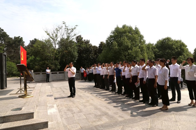 革命初心似驕陽。冒著34℃高溫酷暑,在巍峨的革命烈士紀(jì)念碑前,安糧集團黨委書記曹訓(xùn)立帶領(lǐng)黨員干部緊握右拳,重溫入黨誓詞,用錚錚誓言向黨旗和先烈表達(dá)了矢志不渝守初心、奮發(fā)有為擔(dān)使命的堅定信念。
