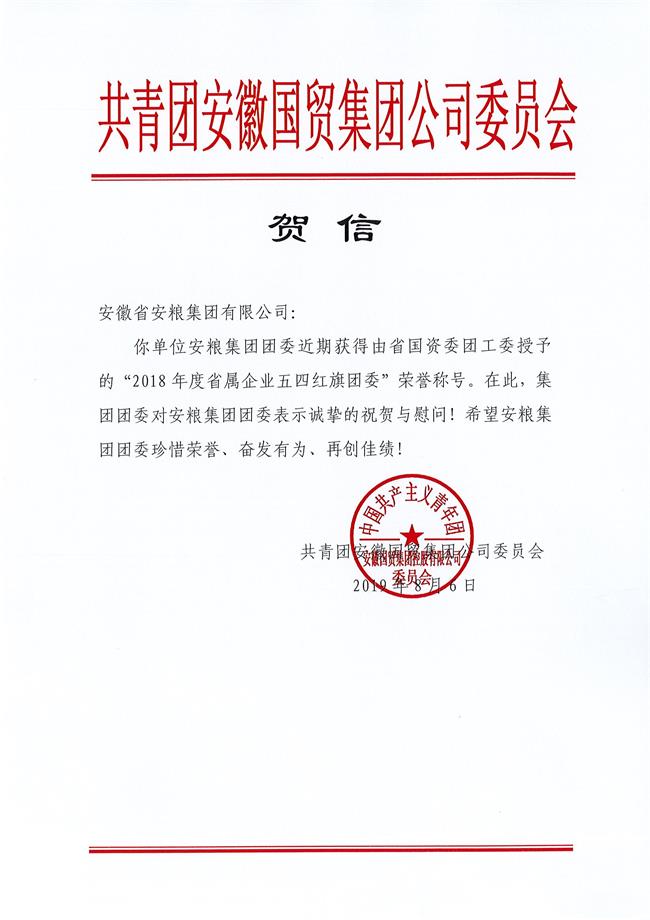 8月6日,國貿集團團委發(fā)來賀信,安糧集團團委近期再獲殊榮——在省國資委團工委開展的“兩紅兩優(yōu)”評選中被授予“2018年度省屬企業(yè)五四紅旗團委”榮譽稱號。