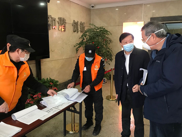 在盛安廣場一樓大廳,包總一行主動(dòng)接受體溫測量和登記,現(xiàn)場檢查了測溫、消毒及人員進(jìn)出登記工作,聽取了現(xiàn)場工作人員的情況匯報(bào),對他們的辛勤工作表示慰問和感謝,充分肯定了公司疫情防控工作。