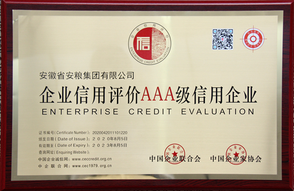 8月20日,中國企業(yè)聯(lián)合會、中國企業(yè)家協(xié)會公布了2020年第一批信用企業(yè)名單,安糧集團首次參評榮獲企業(yè)信用AAA等級認證。