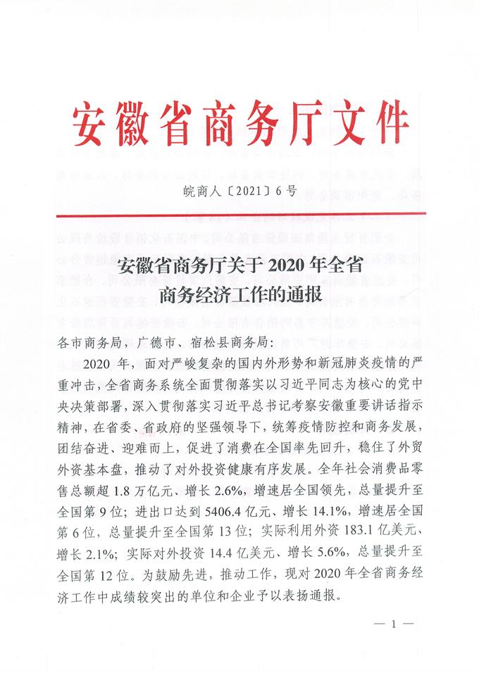 全省商務(wù)工作電視電話會(huì)議2021年1月21日上午在合肥召開。會(huì)上,省商務(wù)廳張箭廳長對(duì)2020年全省商務(wù)經(jīng)濟(jì)工作中成績較突出的單位和企業(yè)予以表揚(yáng)通報(bào)。