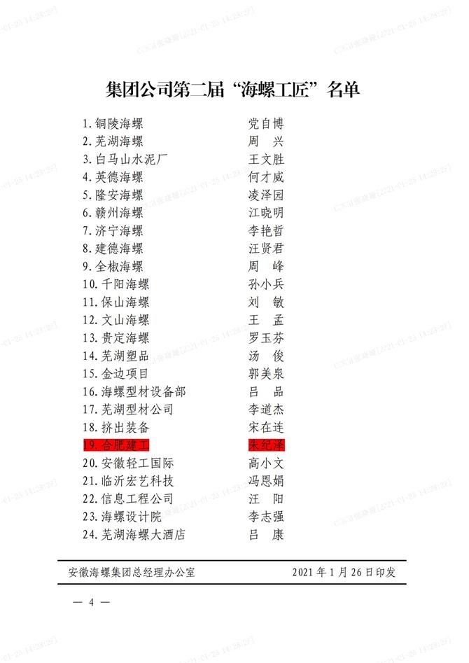 2020年1月26日,海螺集團(tuán)召開2021年工作會(huì)議暨第二屆“海螺工匠”表彰大會(huì),授予24名職工“海螺工匠”的光榮稱號(hào)。合肥建工朱紀(jì)澤名列其中,成為安糧集團(tuán)系統(tǒng)內(nèi)首位獲此殊榮的員工。