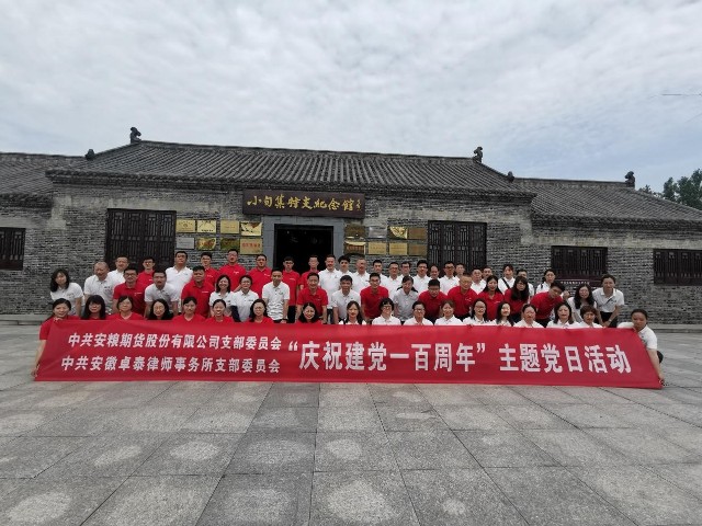 賀百年華誕,恰風(fēng)華正茂。在中國共產(chǎn)黨百年誕辰之際, 6月20日,安糧期貨黨支部與安徽卓泰律師事務(wù)所黨支部共赴中共壽縣小甸集特支紀(jì)念館開展“慶祝建黨一百周年”主題黨日活動(dòng),探尋紅色足跡,接受革命傳統(tǒng)教育。