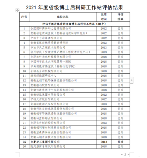 為加強(qiáng)博士后科研工作站建設(shè),推動(dòng)博士后事業(yè)科學(xué)健康發(fā)展,安徽省人社廳對(duì)全省108家2021年度設(shè)站滿(mǎn)3年和首次評(píng)估滿(mǎn)5年的省級(jí)博士后科研工作站進(jìn)行了綜合評(píng)估。最終,合肥建工博士后科研工作站等30家單位獲省優(yōu)稱(chēng)號(hào)。