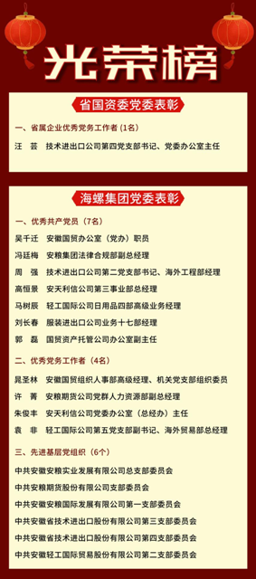 近日,省國(guó)資委黨委、海螺集團(tuán)黨委分別開(kāi)展了省屬企業(yè)和集團(tuán)優(yōu)秀共產(chǎn)黨員、優(yōu)秀黨務(wù)工作者、先進(jìn)基層黨組織表彰,安徽國(guó)貿(mào)所屬技術(shù)進(jìn)出口公司汪蕓同志榮獲省屬企業(yè)優(yōu)秀黨務(wù)工作者稱(chēng)號(hào),吳千遷等7名同志榮獲集團(tuán)優(yōu)秀共產(chǎn)黨員稱(chēng)號(hào),晁圣林等4名同志榮獲集團(tuán)優(yōu)秀黨務(wù)工作者稱(chēng)號(hào),安糧實(shí)業(yè)公司黨總支等6個(gè)基層黨組織榮獲集團(tuán)先進(jìn)基層黨組織稱(chēng)號(hào)。