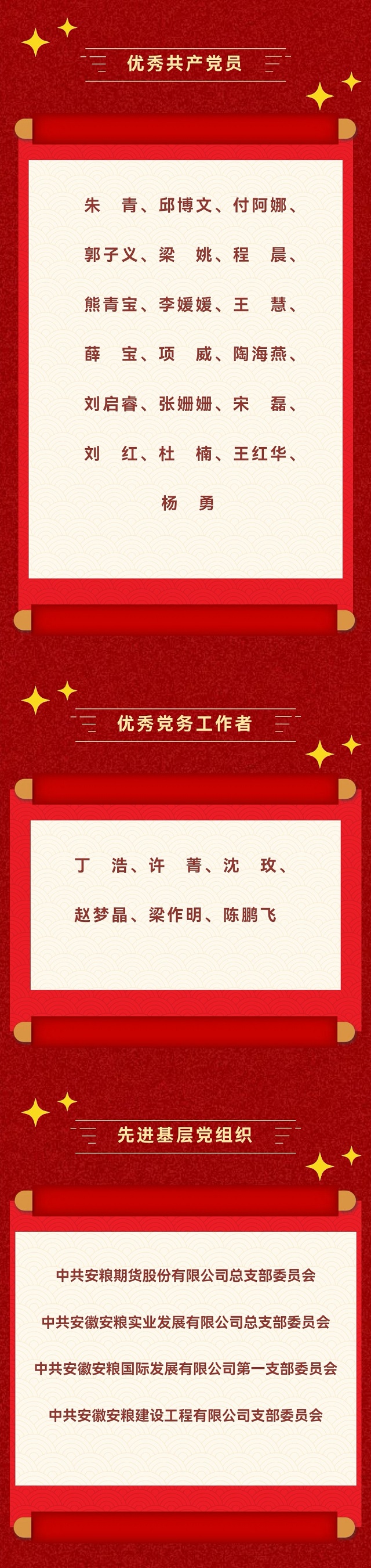 為大力弘揚(yáng)黨的優(yōu)良傳統(tǒng)和作風(fēng),激勵各級黨組織和廣大黨員更加深刻地領(lǐng)悟“兩個確立”的決定性意義,更加自覺增強(qiáng)“四個意識”、堅定“四個自信”、做到“兩個維護(hù)”,努力營造見賢思齊、爭做先鋒的良好氛圍。近日,安徽國貿(mào)黨委對優(yōu)秀共產(chǎn)黨員、優(yōu)秀黨務(wù)工作者和先進(jìn)基層黨組織進(jìn)行了表彰,安糧集團(tuán)19名優(yōu)秀共產(chǎn)黨員、6名優(yōu)秀黨務(wù)工作者和4個先進(jìn)基層黨組織獲得榮譽(yù)。