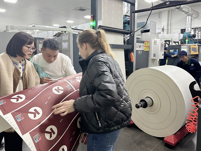 (業(yè)務(wù)員和客戶在紙杯印刷車間對紙杯印刷進(jìn)行確認(rèn))