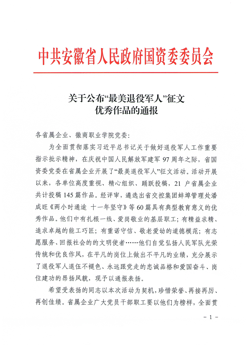 近日,安徽省國資委黨委通報(bào)了“最美退役軍人”征文活動(dòng)優(yōu)秀作品名單。安糧集團(tuán)選送的兩篇作品《退役不改本色 續(xù)寫奮斗篇章》《揮別軍涯 續(xù)寫華章》均獲評(píng)“優(yōu)秀作品”。